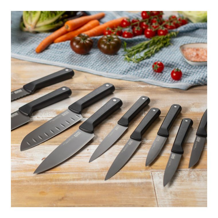 - Warnung: Nicht für Kinder geeignet – Klinge ist sehr scharf. Aufbewahrung im Messerblock empfohlen. Unsachgemässe Verwendung kann zu Verletzungen führen.